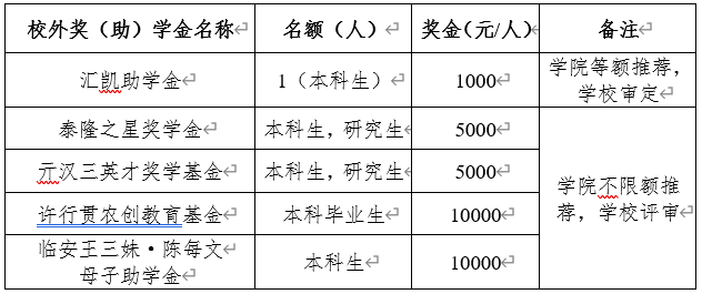 申请对象、申请条件和奖(助)标准请参照各相应奖(助)学金的管理办法或评比条例(详见助学在线网站-规章制度http://xgb.zafu.edu.cn/zxzx/gzzd.htm),名额及奖励标准如下: