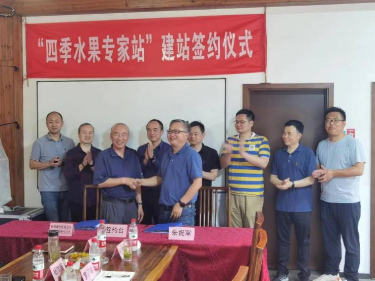 在大家的见证下,朱祝军与王以文代表双方签约共建“四季水果专家站”。