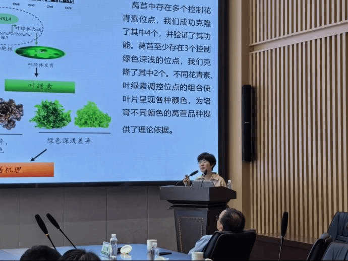 陈老师用丰富的图片、详实的实验数据,从莴苣群体及栽培起源,基因调控莴苣刺的形态、密度,基因调控花青素合成途径,野生莴苣与栽培莴苣花青苷比较,莴苣叶绿色深浅基因精细定位,高花青素和高黄酮类莴苣育种等多个方面,为大家生动讲解了莴苣驯化及营养品质的遗传分析。