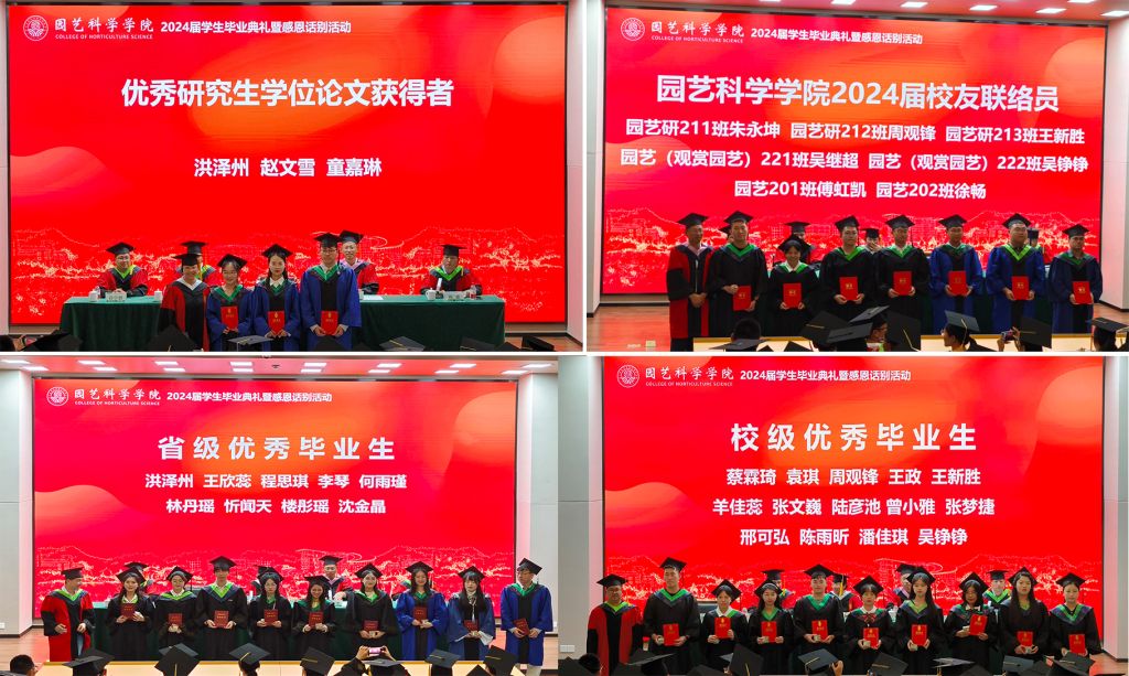 典礼上,公司领导分别为省级优秀毕业生、校级优秀毕业生、优秀毕业论文、优秀学位论文获得者以及2024届员工联络员颁发证书和赠送纪念品,逐一为全体毕业生赠送毕业礼物并合影留念。教师代表徐云敏、硕士研究生代表园艺研213班洪泽州、本科生代表园艺201班楼彤瑶依次发言,分别表达对毕业生的美好祝福和对公司、母院的深切热爱。毕业生代表向毕业班班主任敬献鲜花,致谢恩师。