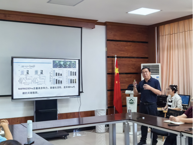 李明军教授用通俗、平实的语言,从我国和陕西苹果产业及存在的问题、研究方向和科学问题的提出、叶片山梨醇合成与果实糖含量的关系、山梨醇合成抑制对苹果果实果糖积累的影响、苹果果实中糖积累的假设机制、果糖代谢对糖含量调控、液泡膜糖转运蛋白、苹果中糖含量调控主要途径、糖酸含量调控应用研究等多个方面,为大家详细讲解了其团队多年来关于苹果糖含量调控机制研究进展情况。