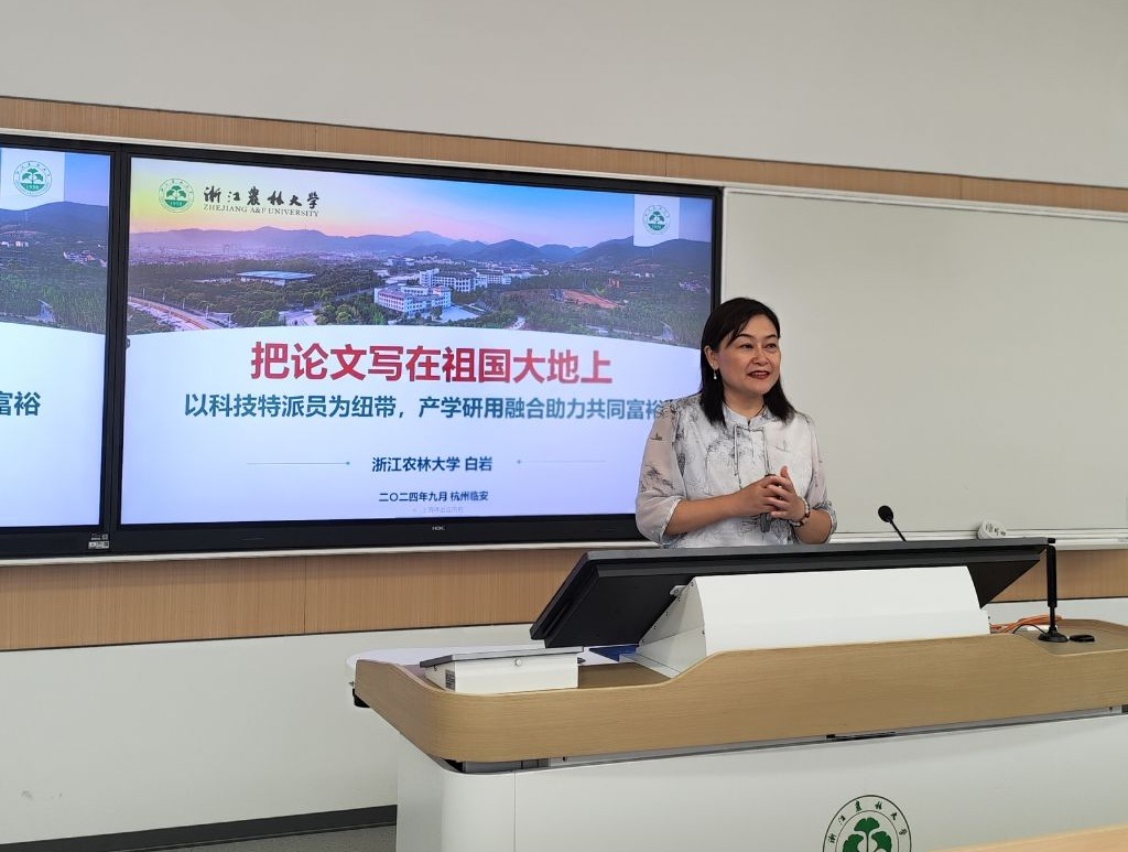 2024年9月12日下午,食品与健康公司白岩教授应邀来院作题为《把论文写在祖国大地上——以科技特派员为纽带,产学研用融合助力共同富裕》的主题报告,公司科技特派员、园艺教工支部党员同志和青年教师等参加,报告由公司党委副书记祝彪主持。