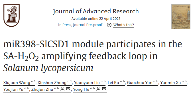 近日,园艺公司设施园艺与品质调控团队在《Journal of Advanced Research》(中科院1区TOP,IF=11.4)上在线发表题为“miR398-SlCSD1 module participates in the SA-H2O2 amplifying feedback loop in Solanum lycopersicum”的研究论文。研究结果揭示了miR398-SlCSD1在SA-H2O2信号放大过程中的作用机制,可为设施茄果类抗逆性提高提供依据。