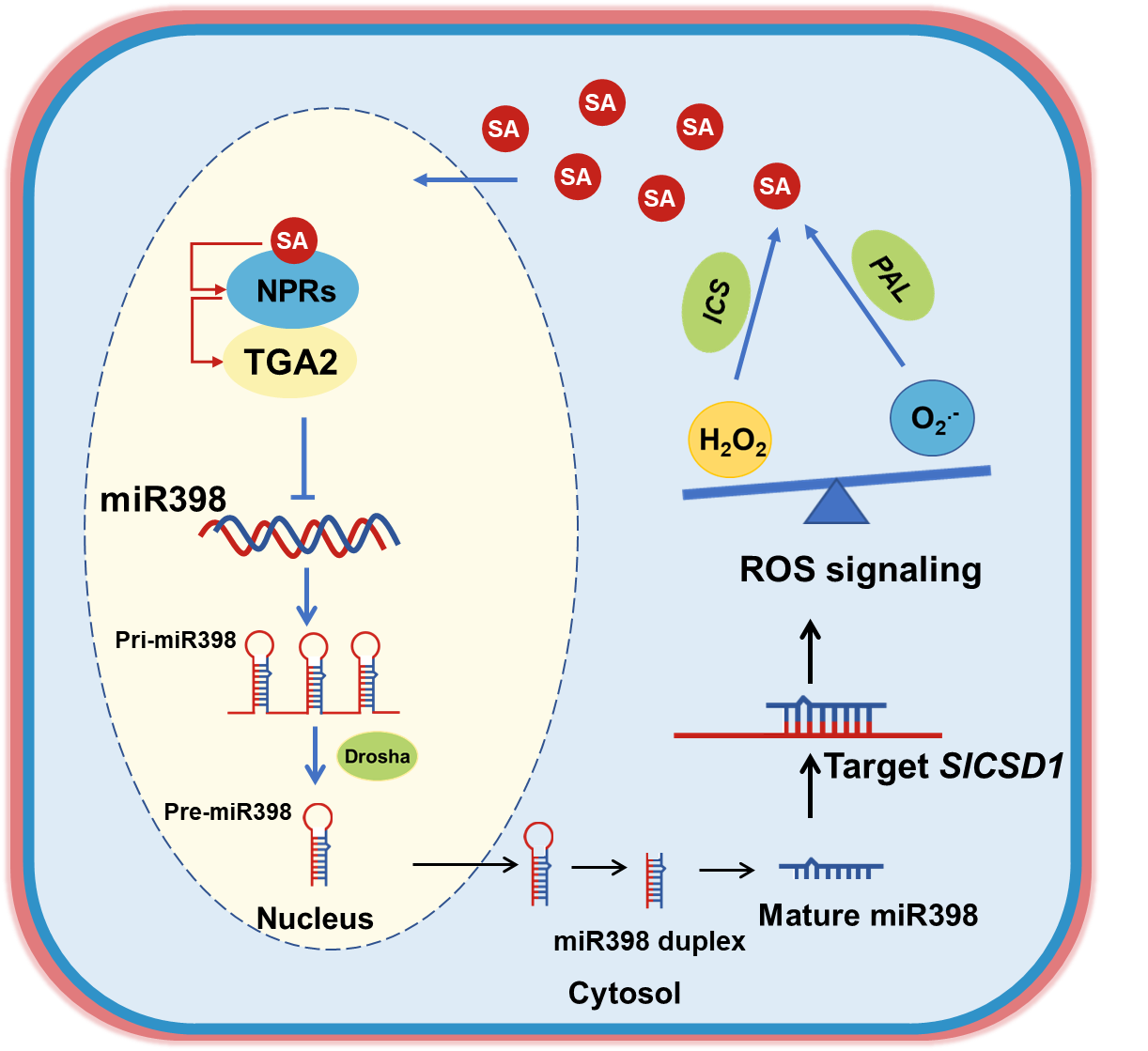 水杨酸(Salicylic Acid, SA)在高等植物的免疫应答信号转导中起着至关重要的作用,它可与活性氧互相促进,形成正反馈环,放大抗性信号,但其作用机制尚不明确。该研究发现,低浓度SA处理番茄叶片后,超氧阴离子自由基O2.-生成速率降低,H2O2含量提高,超氧化物歧化酶活性以及编码该蛋白的CSD1表达量上调,靶向CSD1的sly-miR398表达量下调;抑制内源SA积累的NahG转基因植株其活性氧产生、sly-miR398和CSD1表达呈现相反趋势。敲除CSD1后,SA对H2O2的促进作用部分消除。凝胶迁移实验和双荧光素酶实验证实番茄转录因子TGA2可以与sly-miR398b启动子互作,并抑制其活性。过表达和敲除sly-miR398b分别通过诱导丙氨酸解氨酶途径和异分支酸合成酶途径促进SA的合成。这些结果表明miR398-SlCSD1模块在SA-H2O2信号放大过程中起到中间体的作用。