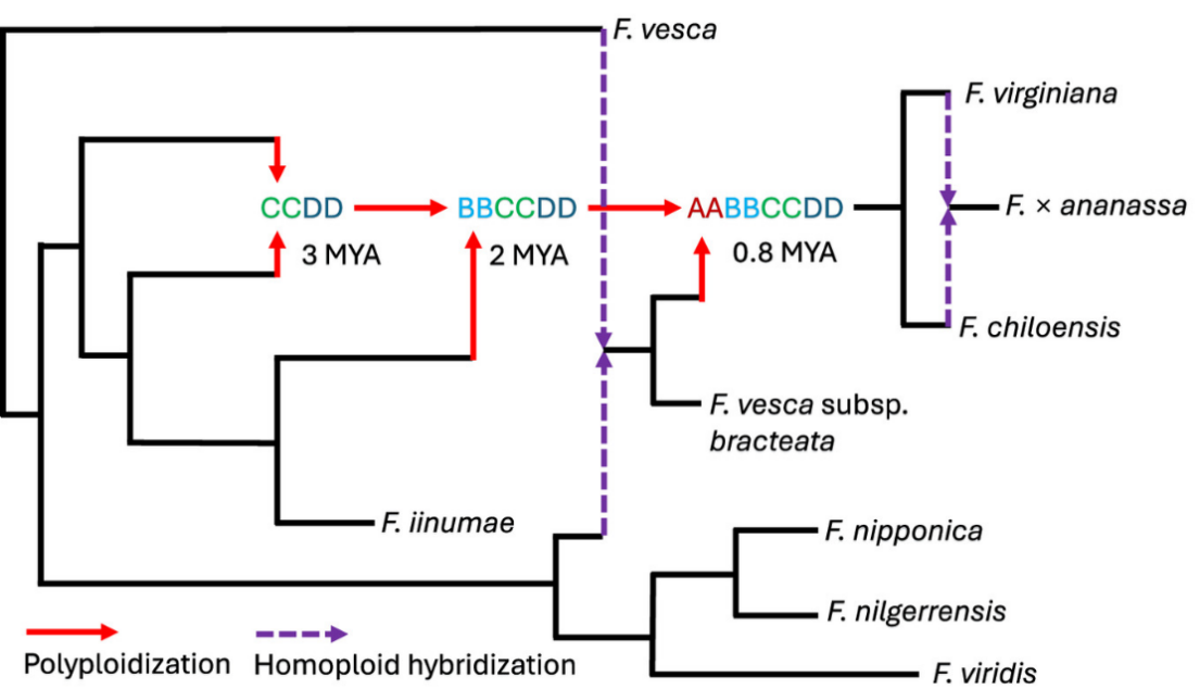 近日,公司范臻教授团队在《PNAS》(《美国科公司院刊》)发表了题为“Homoploid Hybridization Adds Clarity to the Origins of Octoploid Strawberries”(同倍体杂交为八倍体草莓起源提供新线索)的研究成果。该研究提出的整合分析框架通过同步解决祖先物种鉴定、基因渗入检测及多倍化年代估算,推动了多倍体基因组分析的发展,并为研究其他因杂交和不完全谱系分选而难以厘清进化关系的多倍体体系提供了方法论参考。
