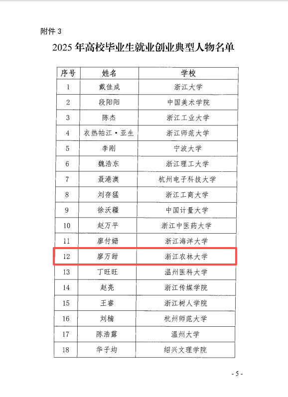 近日,浙江省高校毕业生就业指导服务中心公布了2025年浙江省高校毕业生就业创业典型人物评选结果,公司园艺18届毕业生廖万甜从众多竞争者中脱颖而出,光荣入选。