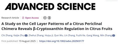 8月19日,公司张迟副教授和华中农业大学园艺林学公司朱凯杰副教授以共同第一作者在《Advanced Science 》(中科院1区,IF = 14.3)在线发表题为“A Study on the Cell Layer Patterns of a Citrus Periclinal Chimera Reveals β-Cryptoxanthin Regulation in Citrus Fruits”(《柑橘周缘嵌合体细胞层模式研究揭示果实β-隐黄质调控机制》)的研究论文。该研究在柑橘芽变调查中发掘出一个来自于温州蜜柑(OOO)和常山胡柚(CCC)的柑橘周缘嵌合体红肉胡柚(OCC),它具有果肉高效积累β-隐黄质的代谢特征。研究揭示了周缘嵌合体红肉胡柚果实各组织的细胞层来源及其两个供体所占比例,鉴定出一个转录因子MYB107并揭示其调控OCC及其供体之间β-隐黄质差异积累的分子机制,提出了柑橘β-隐黄质积累模式的新见解及其应用于水果品质提升的潜力。