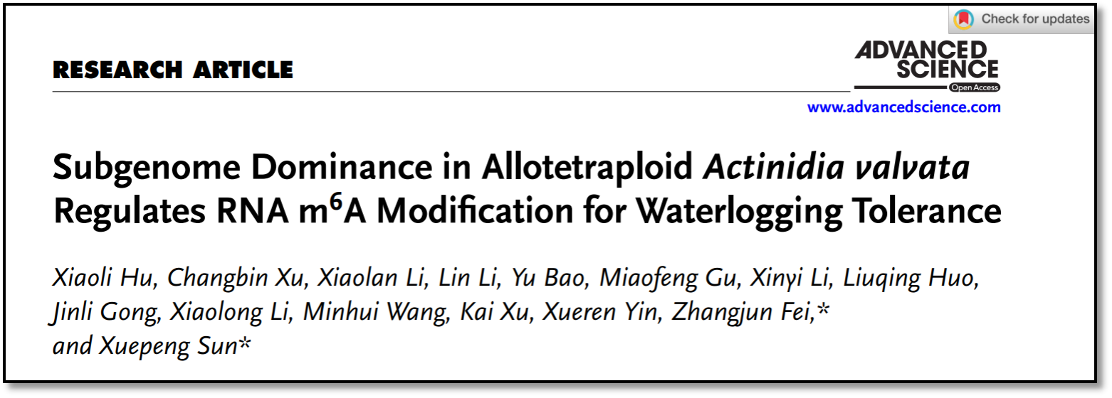 近日,孙学鹏教授团队在国际著名期刊《Advanced Science》(中科院1区,IF=14.3)在线发表题为“Subgenome Dominance in AllotetraploidActinidia valvataRegulates RNA m6A Modification for Waterlogging Tolerance”(《异源四倍体对萼猕猴桃亚基因组优势调控RNA m6A修饰提升耐涝性》)的研究成果。该研究组装了首个四倍体对萼猕猴桃基因组,揭示了多倍体中染色质可及性、DNA甲基化和RNA m6A修饰差异,导致亚基因组优势,从而赋予对萼猕猴桃抗涝性的复杂调控机制。为多倍体育种提供了新的思路。